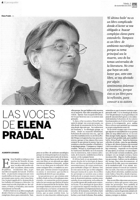 Y, claro, si fue su autora, Elena Pradal, quien le otorgó voz a esos personajes, no sólo desde la constatación de los hechos, sino desde algo más que los rudimentos del budismo y la mitología griega, es decir, desde su asunción intelectual, habremos de convenir otra vez, que en este libro también está la voz de Elena Pradal. Porque en la poesía hay muy poca inocencia y porque si hay alguna clave para conocer lo que piensa la autora hay que remitirse a esos dos mundos: el budismo y la mitología griega. Y tampoco es imprescindible. Porque si el principal temor de los habitantes del libro no es la muerte sino la inminencia, más o menos adivinada, de la muerte, también lo es el de la autora y el de cualquier lector.